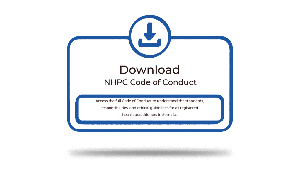 This Code of Conduct is designed to protect the public by promoting best practice in the Somali health system. Compliance with the Code will ensure that you are ‘working to standard’, providing high quality, compassionate treatment and care to patients and their families. The Code describes the standards of conduct, behaviour and attitude that the public and people who use health services are entitled to expect of a registered health practitioner. You are responsible for and have a duty of care to ensure that your conduct does not fall below the standards detailed in this Code. Nothing that you do, or omit to do, should harm the safety and wellbeing of patients and the public.